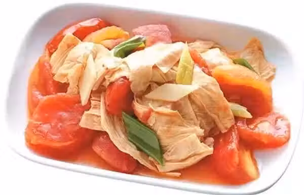 蕃茄2顆、豆包3片、薑片10公克、高湯100cc、太白粉水少