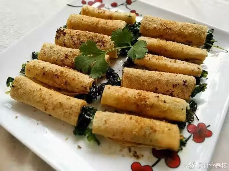 1、豆腐皮切成寬約6厘米的長條,油麥菜洗乾淨,切段(長度略大於豆腐皮的寬度)。