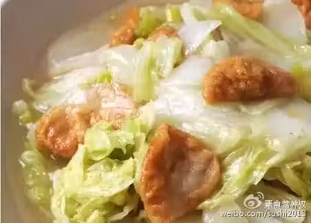 4、放入麵筋,繼續翻炒至麵筋變軟和白菜梆略微透明後,即表示已經成熟。