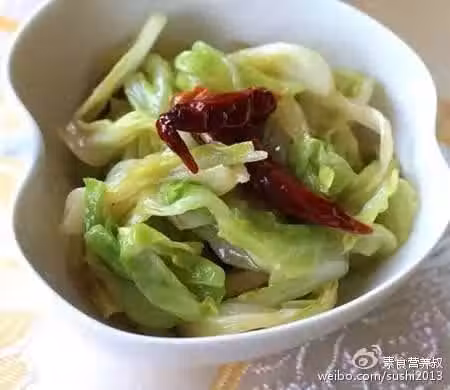原料:圓白菜1個(300g)、花椒5g、辣椒干5個、醋1茶匙(5毫升)、生抽1茶匙(5毫升)、白糖1茶匙(5g)