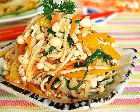 食材:金針菇、黃甜椒、生抽、香醋、香油、糖。