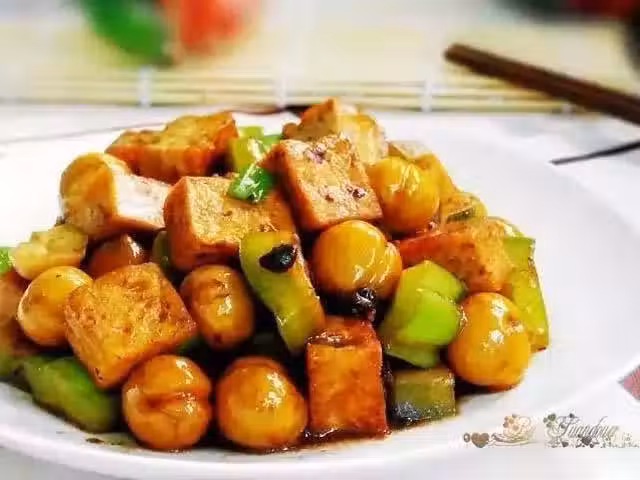 6、加入豆腐和板栗略炒。