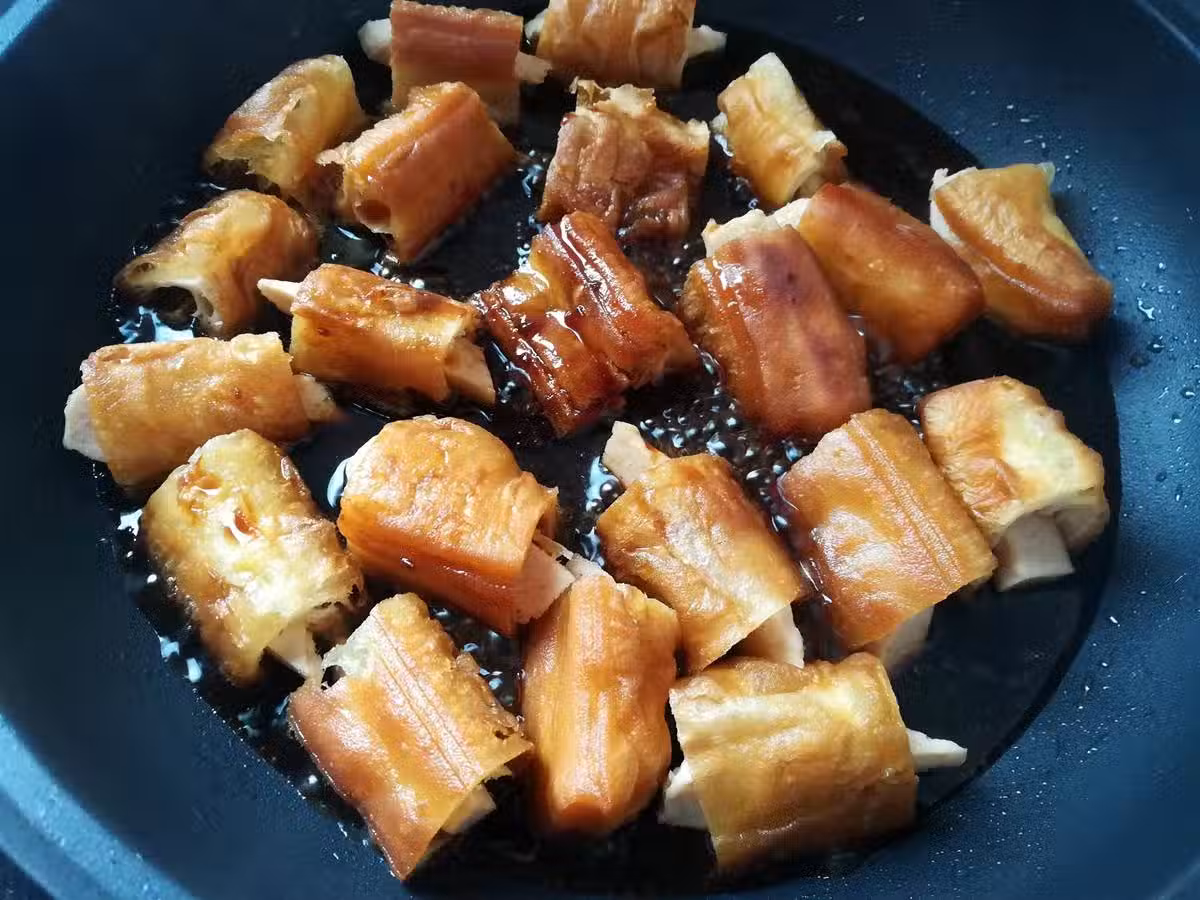 熱鍋放油,放入素排骨煎一下,有些做法是油炸,我覺得油炸的話,油條會吸油,吃起來有些油膩,不是很健康。