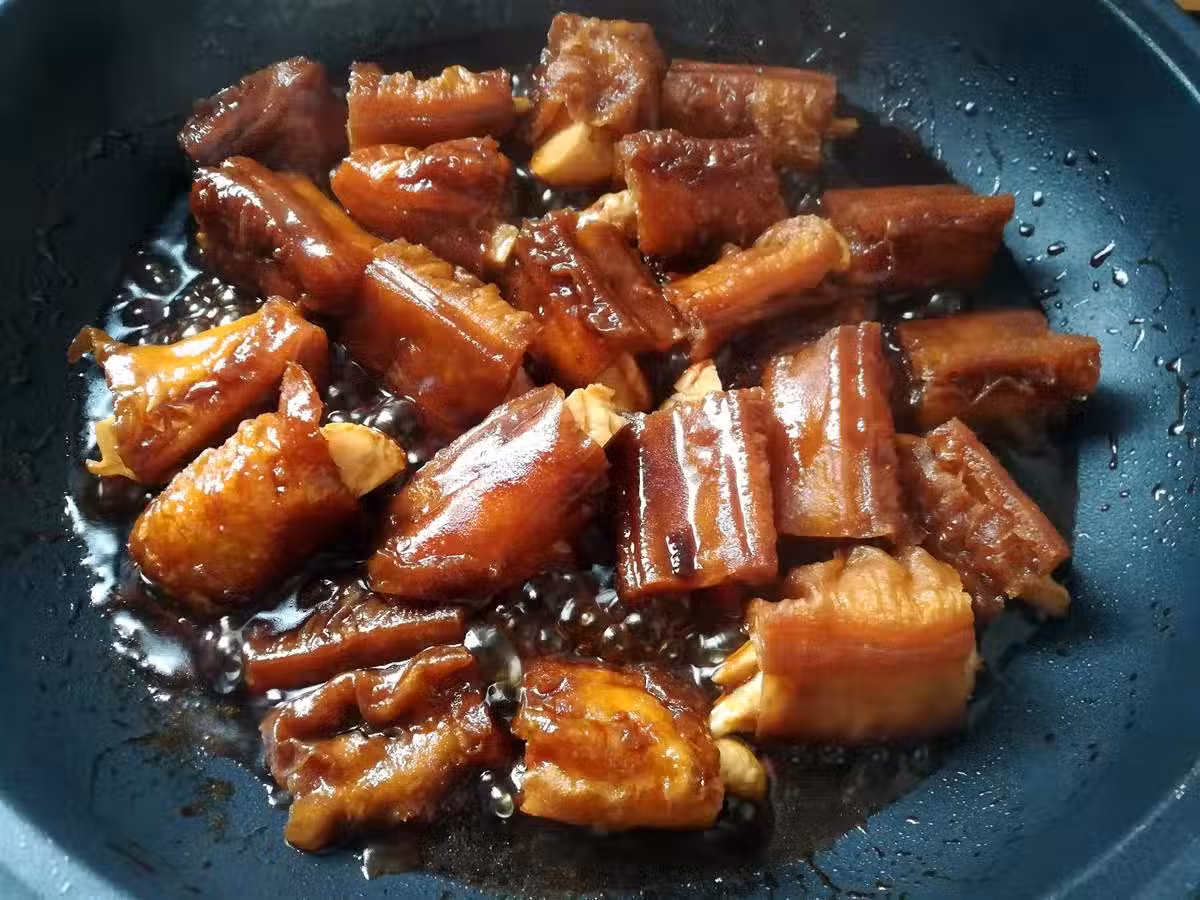 倒入調好的糖醋醬汁,轉中小火,一邊加熱一邊翻炒,讓每一塊素排骨都裹上糖醋醬汁。