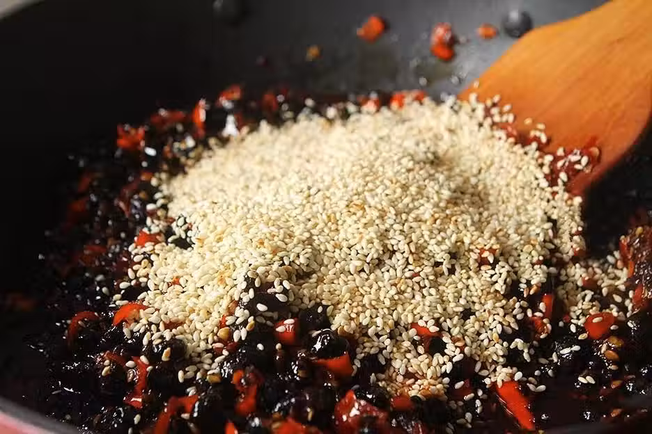 6、一直翻炒至出紅油,豆豉變軟,最後加入炒好的白芝麻翻拌均勻,白芝麻除了能增加香味,也能令口感非常好,所以一定要放,繼續炒2分鐘左右,散發出辣辣的香味,豆豉辣醬就做好啦;放涼後盛入消毒的玻璃容器里密封保存,為了保質期更長,也最好放入冰箱中進行保存。