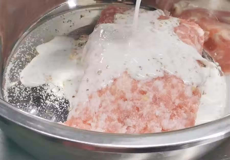 6、只對肉餡進行攪拌是肯定不行的,還沒完,接下來還有一個步驟,用手把肉餡抓起來,然後再摔回到盤中去,就重復這樣的動作,對肉餡進行摔打1分鐘以上,這樣做的目的就是要讓肉末攪打上勁,一直摔打到肉餡有點發粘為止,這樣做的目的就是要確保蒸出來的肉吃起來才不會柴。