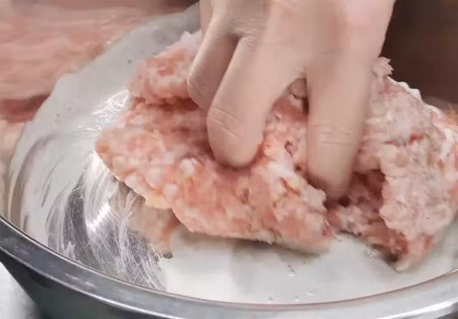 7、一般早餐店的雪梨肉餅湯裡面的肉餡只有50克左右,這樣的分量還不夠塞牙縫呢?所以自己在家裡做這分量最少要多1倍以上吧!這里是230克的肉餡,我總的分成了4份,這樣才能吃過癮吧!或者你用1個大盤做成1份也可以。