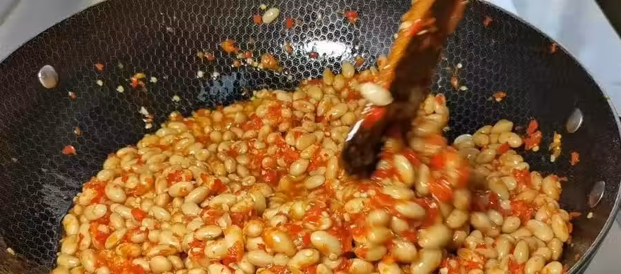 9:豆子中的水份炒干後,鍋中的油看著清亮了,這時我們加入一勺的甜面醬,半勺郫縣豆瓣醬將它們翻炒均勻。