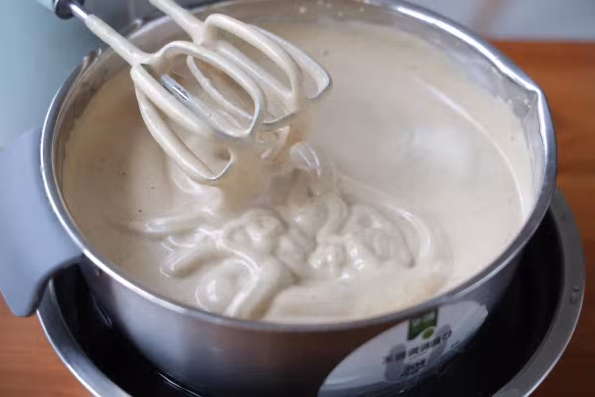 7、提前準備好的味道比較淡的植物油,盛2勺麵糊進去快速拌均勻,然後倒回到大碗中,繼續拌均勻,再把過篩好的麵粉分次少量的加進去翻拌均勻;