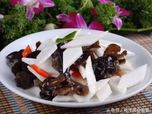 4、坐鍋加植物油燒熱,下蔥薑絲爆香,倒入蠔油山藥和木耳,烹入料酒,撒上精鹽翻炒均勻,勾薄芡,放味精,淋明油出鍋裝盤。
