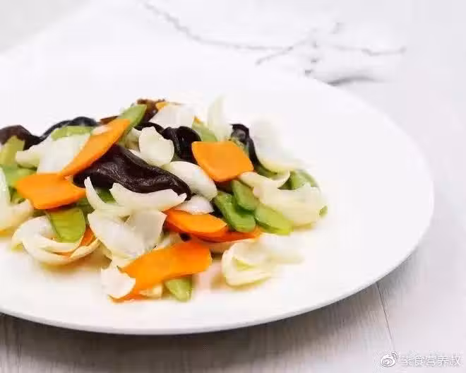 2. 鍋內放入適量水,放入黑木耳煮開,焯水1分鐘。3. 加入荷蘭豆,加一點點食用油,一起焯水變綠撈起,最好是凈水沖一下。4. 乾淨的炒鍋內加入2勺食用油,倒入胡蘿蔔片翻炒片刻。5. 加入百合繼續翻炒(可適當加點水防止粘鍋)。6. 加入荷蘭豆和黑木耳,再加點鹽和蔬果粉調味。7. 繼續翻炒片刻至百合變色透明,即可出鍋裝盤。