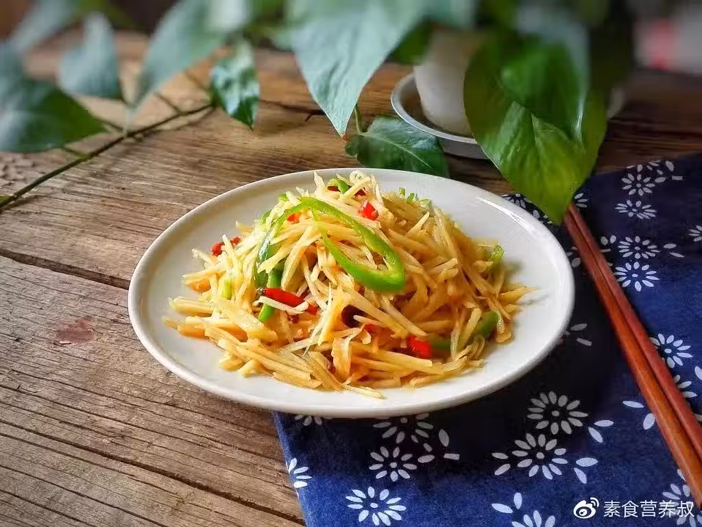 2. 土豆絲放冷水裡洗一下,洗掉澱粉,撈出備用。3. 油鍋燒熱,放油,干紅辣椒、花椒爆香。4. 下土豆絲翻炒,加1茶匙生抽、醋。5. 下青椒絲,加鹽,大火翻炒,如果有些干可以加兩勺水。6. 加小米辣,炒勻關火。
