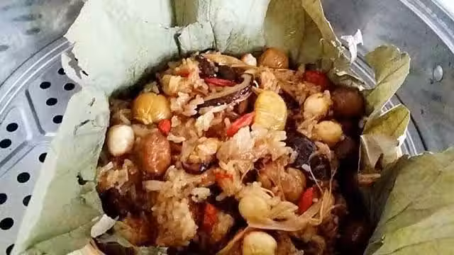7. 第一次煮好後將糯米飯翻鬆,加入熟栗子和枸杞子拌勻,再盛到鋪了濕籠布(我用的荷葉)的籠屜上,上汽後蒸10分鐘。