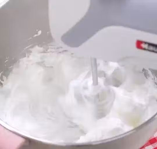 之前有小夥伴反應,這一步糖漿容易凝固變硬,大家還是要注意細節,糖漿不要倒在打蛋盆底部、四周、以及打蛋頭上,要倒在蛋白霜表面。因為打蛋盆和打蛋頭是金屬的,溫度比較低,容易導致糖漿凝固。