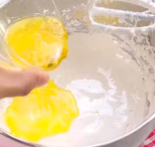 這里再說一個小技巧,如果攪拌時糖漿順著打蛋頭往上爬,通常是由於停在一個地方慢慢攪導致的,記住千萬不要停,加快轉圈的速度,並快速上下抖動打蛋器,糖漿會被拽下去的。