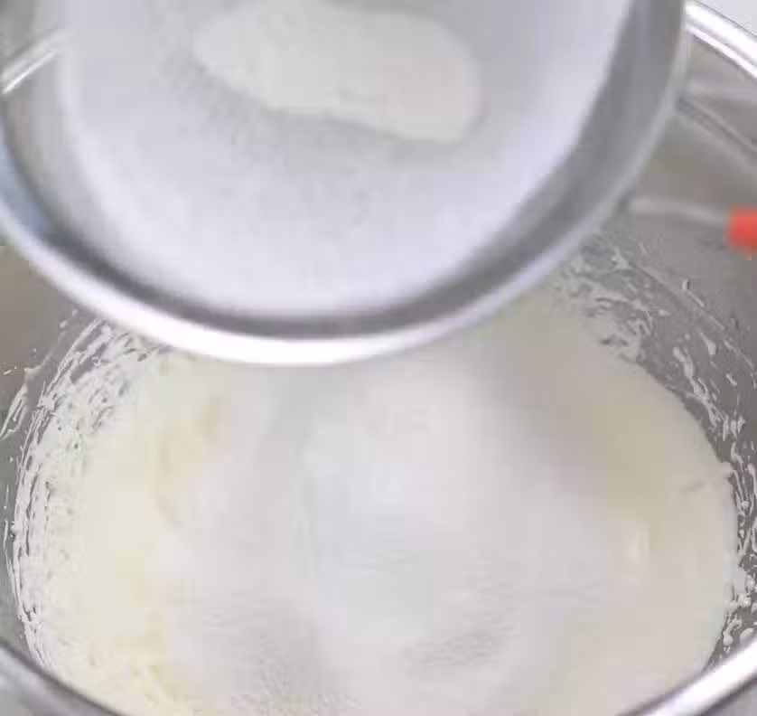 過篩加入57g高筋麵粉,可能有小夥伴問做餅乾為什麼不用低筋麵粉,因為用低筋麵粉這款餅乾就太酥,很容易碎,而高筋麵粉才是香脆的口感。