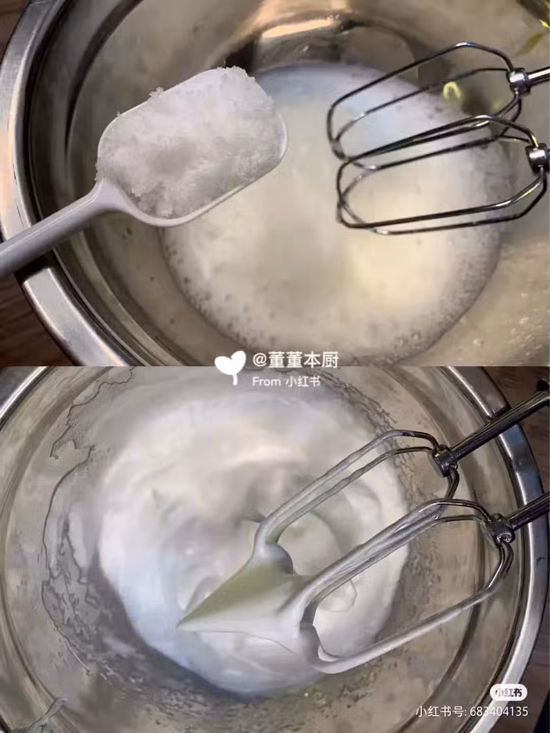 6] 取一部分蛋白放之前的蛋黃糊里,用翻拌的方式攪拌,再放蛋白繼續翻拌……最後所有蛋白和蛋黃糊全部混在一起翻拌。