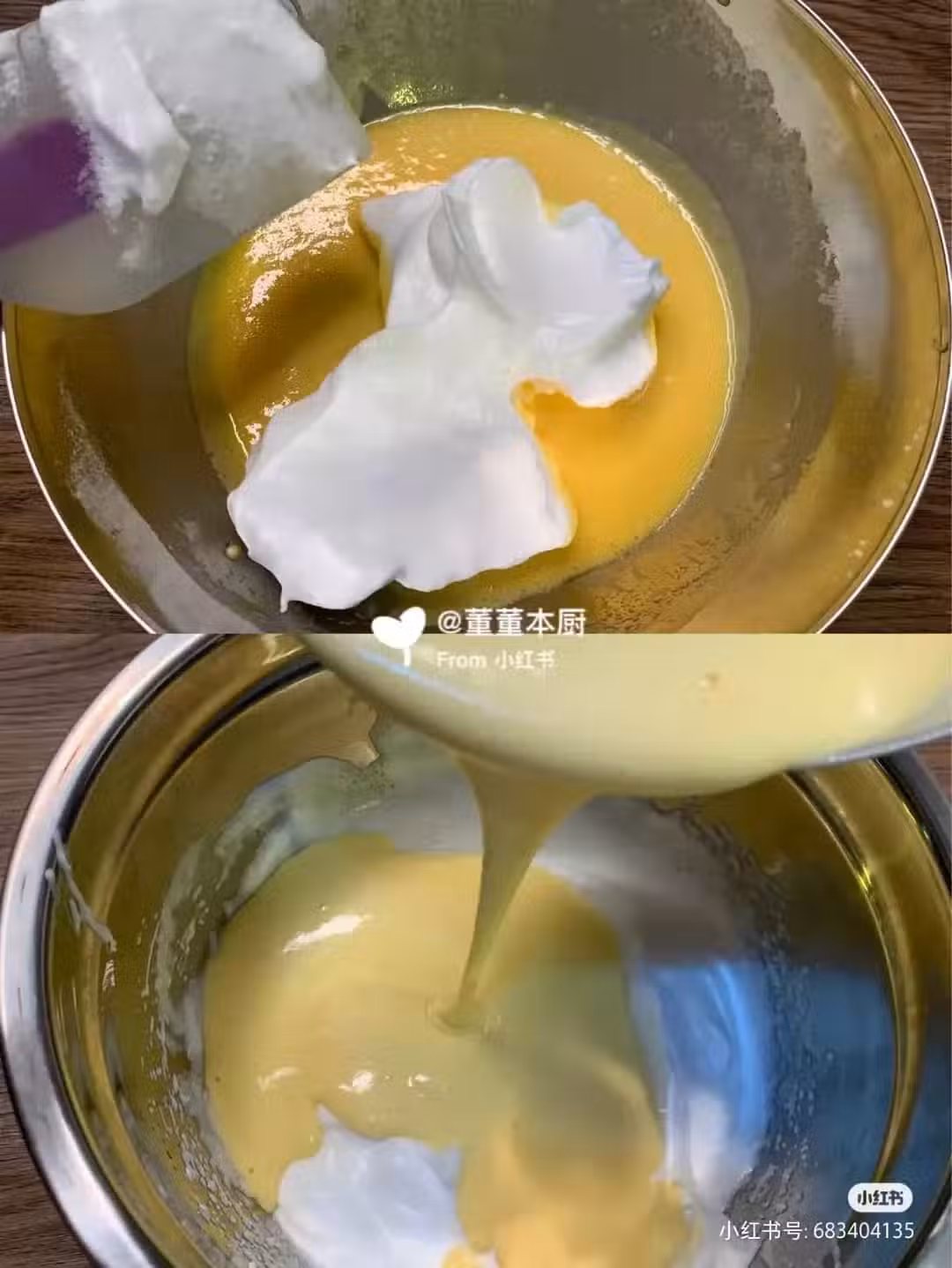 7](⚠️烤箱這個時候就要開始預熱了)翻拌均勻全部倒入麵包吐司磨具里,芝士片有的放,沒有就不放,注意,蛋黃糊先倒入三分之二再放芝士片,否則芝士片會沉到底部。