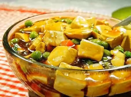 豆腐一塊半、豌豆、胡蘿蔔丁少許。薑絲、蘑菇粉、花椒水、醬油、白糖各少許。
