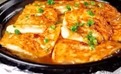 2、豆腐切丁,用中火煎定型並成金黃色盛出。