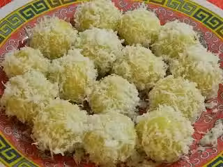 紫薯泥 100克、糯米粉 150克、冰水 50克 - 80克、馬六甲椰糖 100克(切碎)、嫩白椰絲 150克 + 鹽 1/4茶匙 (蒸軟)