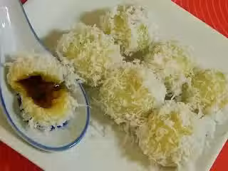 5)然後把圓粒撈起,粘上蒸軟後的椰絲就可以享用了。