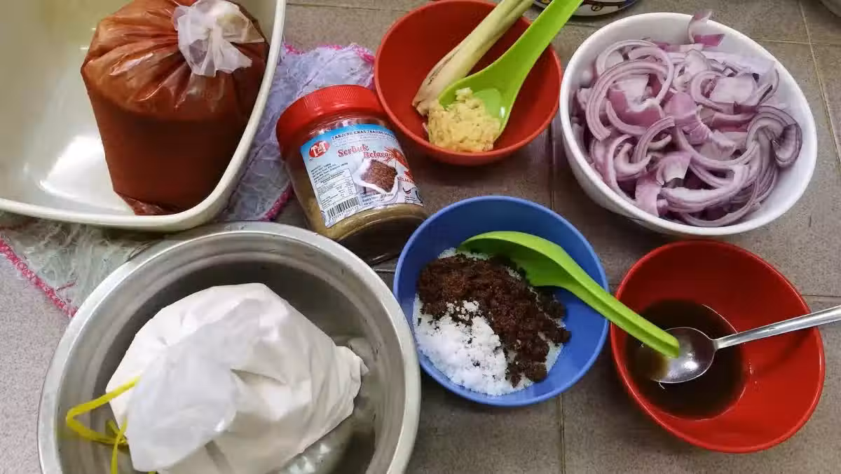 1)燒熱食油,加入洋蔥頭,香茅和蒜蓉炒香和軟。