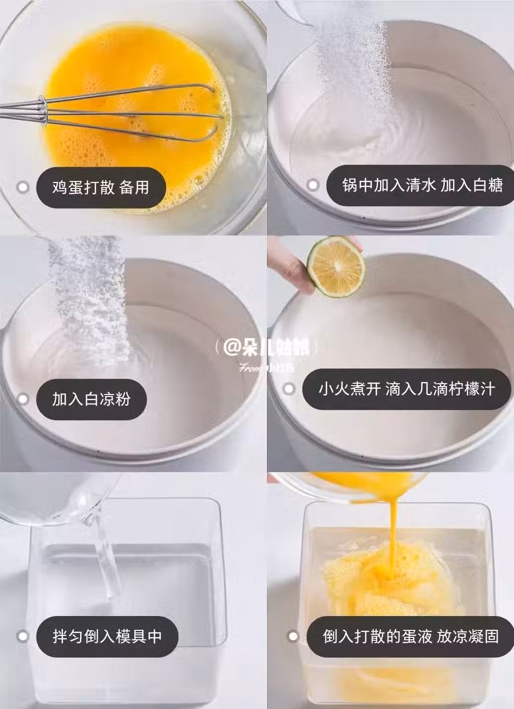 1️⃣鍋中加入清水,加入白糖、白涼粉,小火煮開,滴入幾滴檸檬汁,拌勻倒入模具中,倒入打散的蛋液,像蛋花湯一樣融合在一起,放涼凝固。