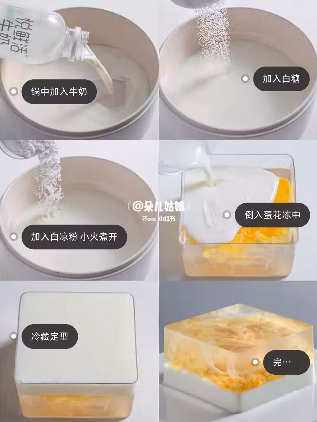 2️⃣鍋中加入牛奶,加入白糖、白涼粉,小火煮開,倒入凝固成型的「蛋花凍」中,冷藏定型,完成啦