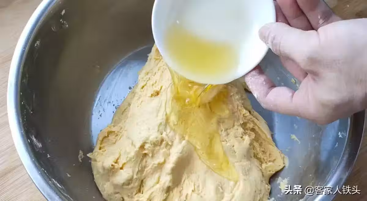 第五步:南瓜粉糰揉成軟硬適中就可以了,最後把準備好的玉米油倒進去,繼續用手把它揉均勻,揉成光滑有韌性的南瓜粉糰。