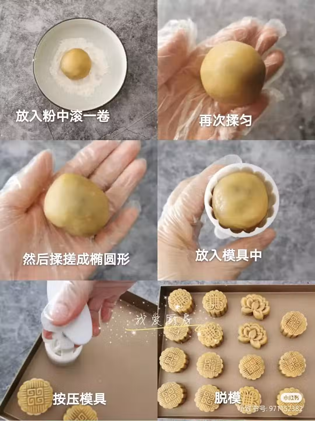 13]再轉上火175度下火155度烤12~15分鐘(烘烤的時間與溫度僅做參考,要根據自己烤箱的實際情況來調整)注意觀察,月餅表面上色後取出,晾涼,然後密封保存1~2天回油後即可。