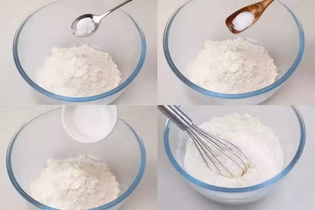 2、接著加入1g鹽、1g泡打粉和9g細砂糖,把所有粉類混合均勻。如果你不想放泡打粉,也可以不放,但口感會有一丟丟差別。
