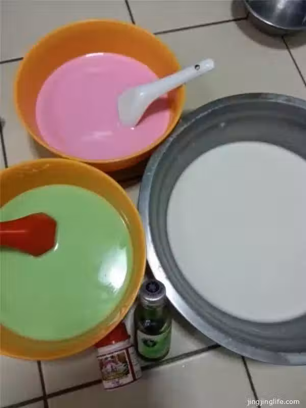 3)準備一個已經塗上適量食油的9寸蒸盤,先入蒸爐餘熱3分鐘。然後倒入一小碗麵糊,以最小火蒸5分鐘,再加上兩一種顏色麵糊,繼續蒸5分鐘。