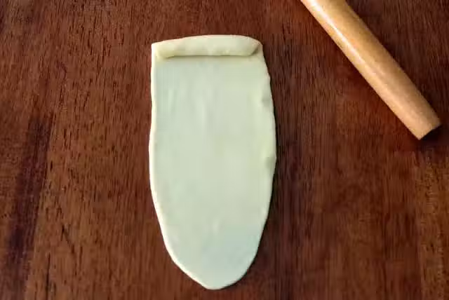 4.把包好的水皮壓扁,用自己的棍子成長形,由上面圈下成條狀。