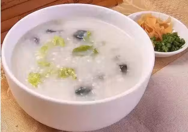 4、水煮開,下米煮滾後改小火,加入皮蛋、瘦肉絲、鹽、雞精、蔥花,煮約50分鐘後,放入餘下的皮蛋塊和蔥花,微火煮10分鐘即可。