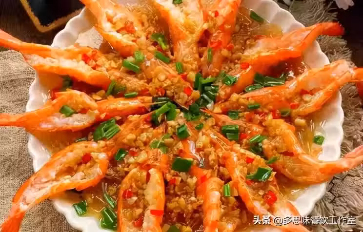 3粉絲鋪盤中,放蝦淋蒜蓉汁;水開上鍋蒸15分鐘,取出撒蔥花,淋上熱油即可