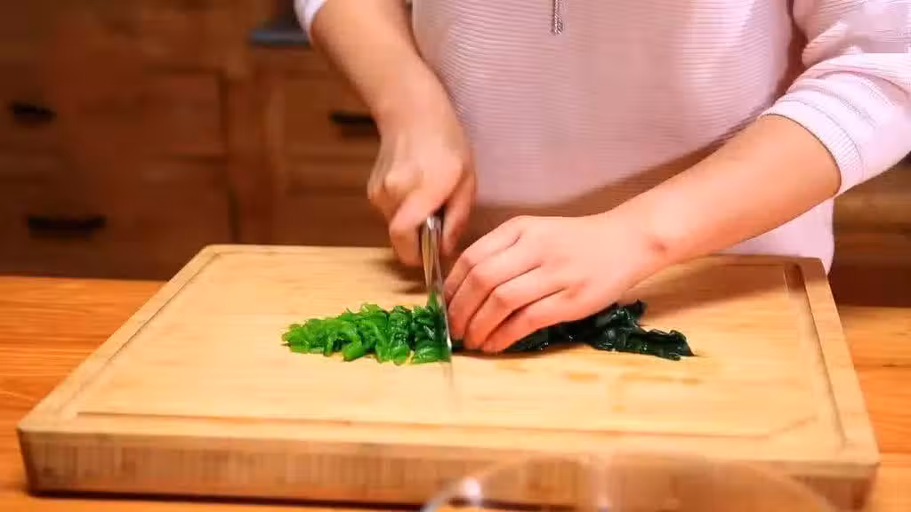 菠菜擠幹水後剁碎,加入面醬、醬油、植物油和香油調拌均勻。