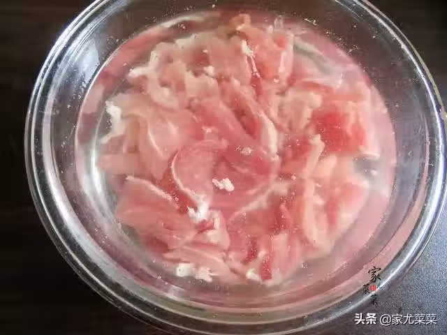 1、取1小塊新鮮的豬肉逆著紋路切成薄片,放入清水中浸泡30分鐘,這樣可以去除血水和減輕腥臊味,肉片滑鍋時浮沫也沒有那麼多。