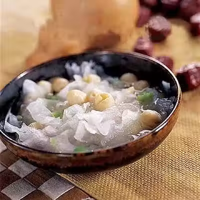 原料:干銀耳25克、竹筍300克做法:將干銀耳用水泡開、去根蒂切小,竹筍洗凈,鍋內加水煮沸,放入銀 耳 竹筍,溫和煮5分鐘,加鹽調味即可。