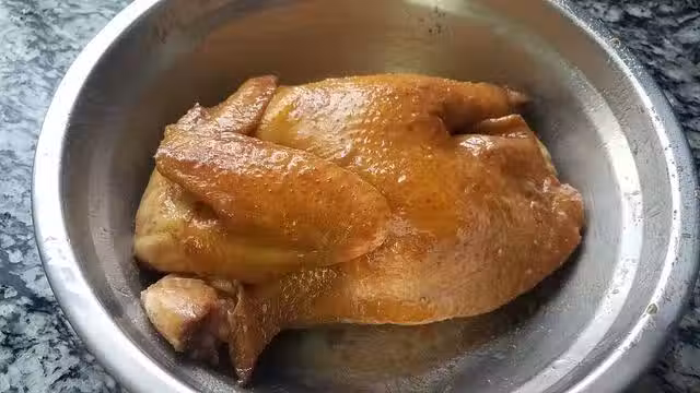4.鍋里水燒開,把準備好的雞肉放進去蒸,開大火蒸10-15分鐘。如果是整隻雞的話,蒸的時間要長一點。時間到了,就可以打開蓋子出鍋了,出鍋後讓雞肉稍微放涼一下。如果不知道雞肉熟了沒有,可以用根筷子在雞腿上插個小洞,如果沒有血水流出來就證明熟了。
