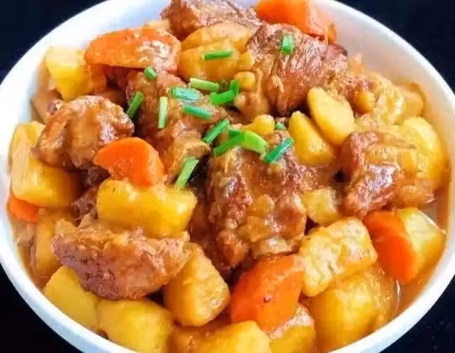 2、下排骨,加醬油翻炒一會兒,加水,下土豆改中火。