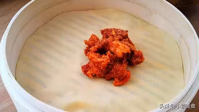 6.籠屜上鋪一張干豆腐,再把肉倒入籠屜里舖均勻