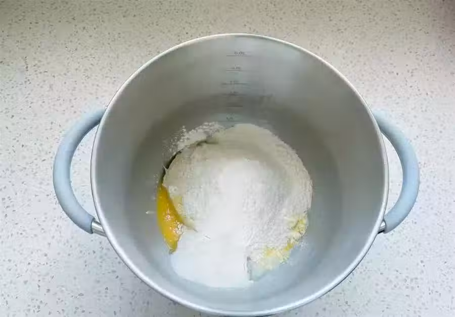 6、低速揉成麵團,轉中速揉至光滑有彈性,加入軟化的黃油粒,揉進麵團裡。
