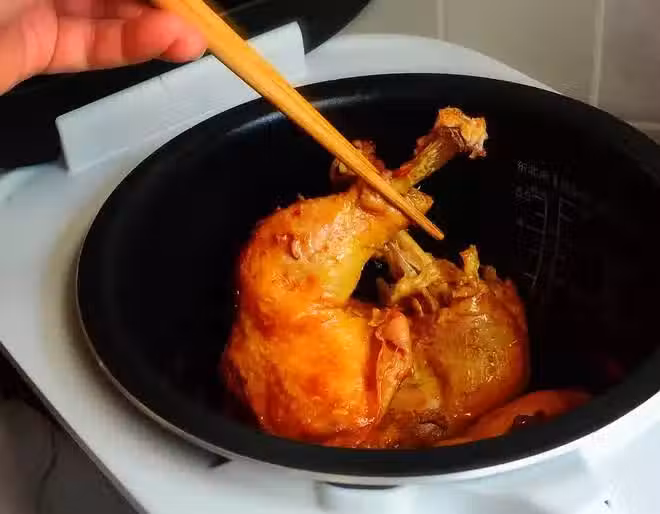 用煮飯功能,煮兩個30分鐘。第一個30分鐘結束後,把雞腿翻個兒,然後繼續30分鐘,打開蓋,看上色情況,顏色滿意,可停。要根據不同的電飯煲功能情況選擇。