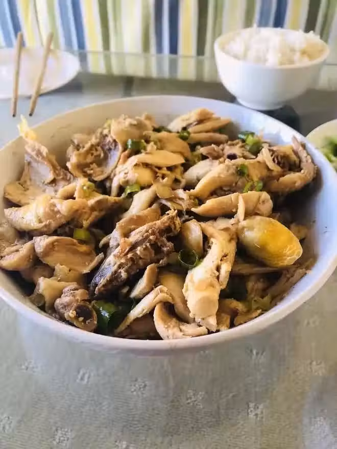 雞腿用手撕開,加入鹽焗粉、糖、蔥油、芝麻油、白芝麻和蔥花,充分攪拌均勻即可。