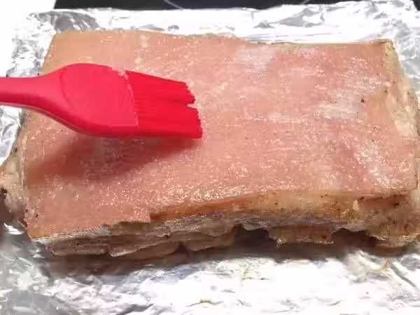 把豬肉取出,把豬肉反面(皮向上),用叉子在豬皮上插洞,然後在豬皮上掃上皮料,用鋁紙包著豬肉的四邊,轉"烘焗"230度,再烤20分鐘。