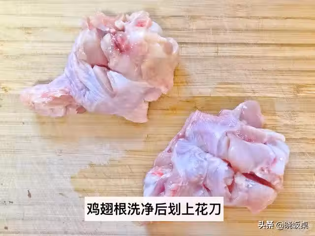 3、用流動的清水把雞翅根清洗乾淨,洗凈後在雞翅根正反面打上花刀,這樣比較容易入味。