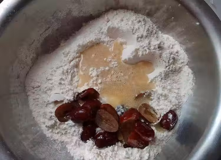 3.充分攪拌,用麵糰發酵。紅棗蒸熟後,用手揉捏會腐爛。你也可以把它們拿出來,用刀把它們切成小塊,然後揉捏。