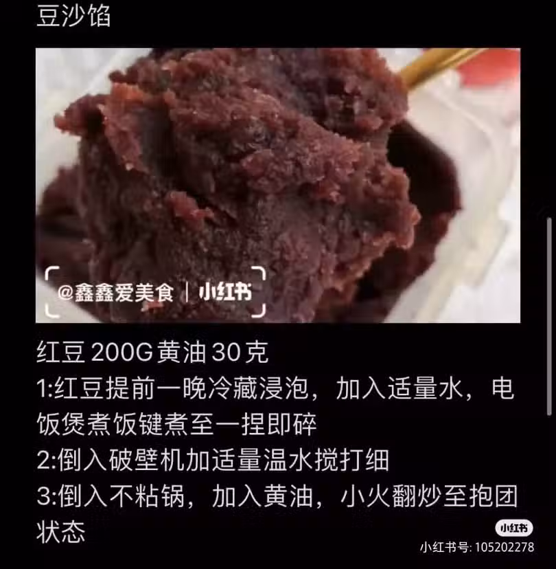 1:紅豆提前一晚冷藏浸泡,加入適量水,電飯煲煮飯鍵煮至一捏即碎