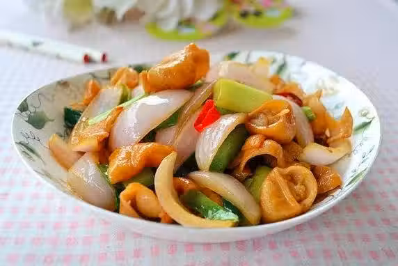 4、青椒洋蔥炒軟後下入肥腸大火爆炒,再加少許鹽和醬油。